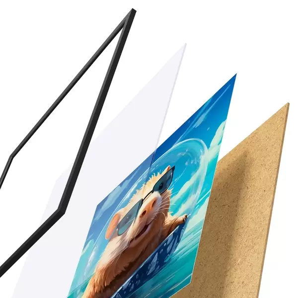 Das Poster besteht aus einem Rahmen, Plexiglas, einem gedruckten Bild und einer Rückwand aus Spanplatten. Dank der Halterungen auf der Rückseite kann das Poster sofort an die Wand gehängt werden.