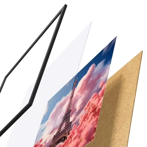 Das Poster besteht aus einem Rahmen, Plexiglas, einem gedruckten Bild und einer Rückwand aus Spanplatten. Dank der Halterungen auf der Rückseite kann das Poster sofort an die Wand gehängt werden.