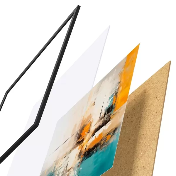 Das Poster besteht aus einem Rahmen, Plexiglas, einem gedruckten Bild und einer Rückwand aus Spanplatten. Dank der Halterungen auf der Rückseite kann das Poster sofort an die Wand gehängt werden.