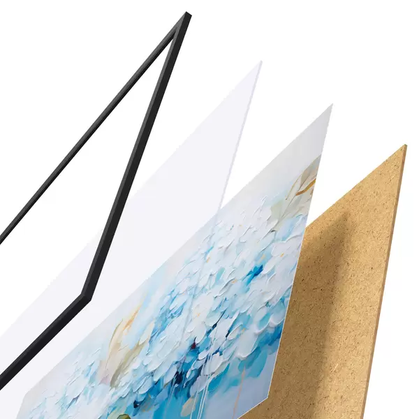 Das Poster besteht aus einem Rahmen, Plexiglas, einem gedruckten Bild und einer Rückwand aus Spanplatten. Dank der Halterungen auf der Rückseite kann das Poster sofort an die Wand gehängt werden.