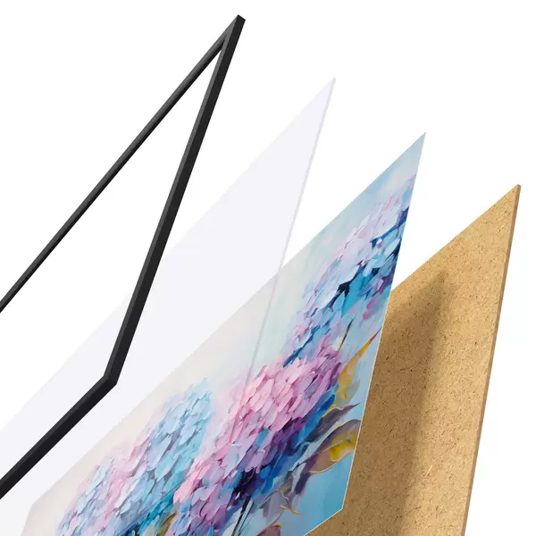 Das Poster besteht aus einem Rahmen, Plexiglas, einem gedruckten Bild und einer Rückwand aus Spanplatten. Dank der Halterungen auf der Rückseite kann das Poster sofort an die Wand gehängt werden.