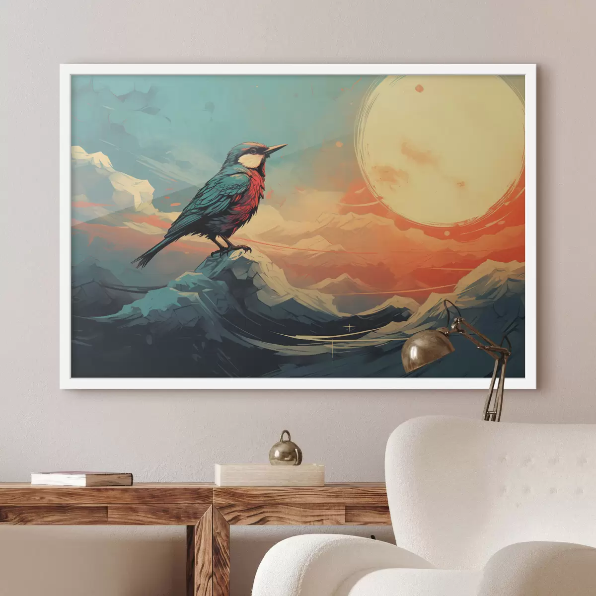 Poster Künstlerische Landschaft mit Vogel und leuchtendem Himmel f45060