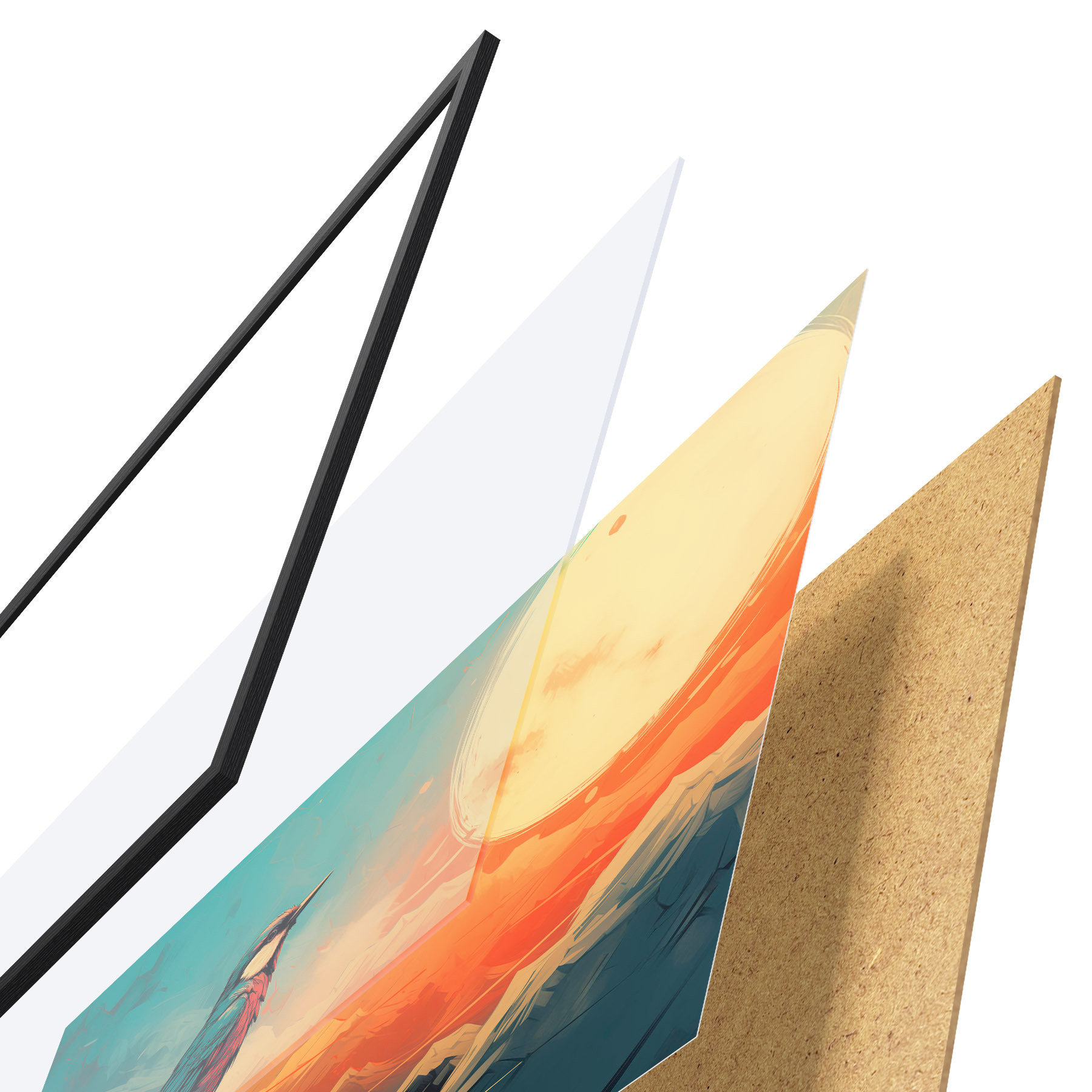 Das Poster besteht aus einem Rahmen, Plexiglas, einem gedruckten Bild und einer Rückwand aus Spanplatten. Dank der Halterungen auf der Rückseite kann das Poster sofort an die Wand gehängt werden.
