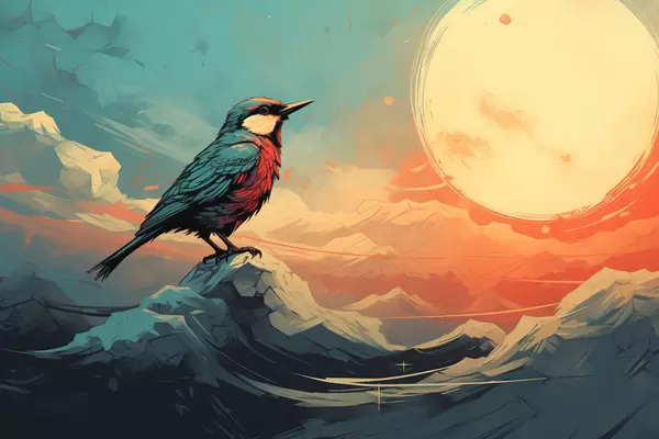 Poster Künstlerische Landschaft mit Vogel und leuchtendem Himmel f45060