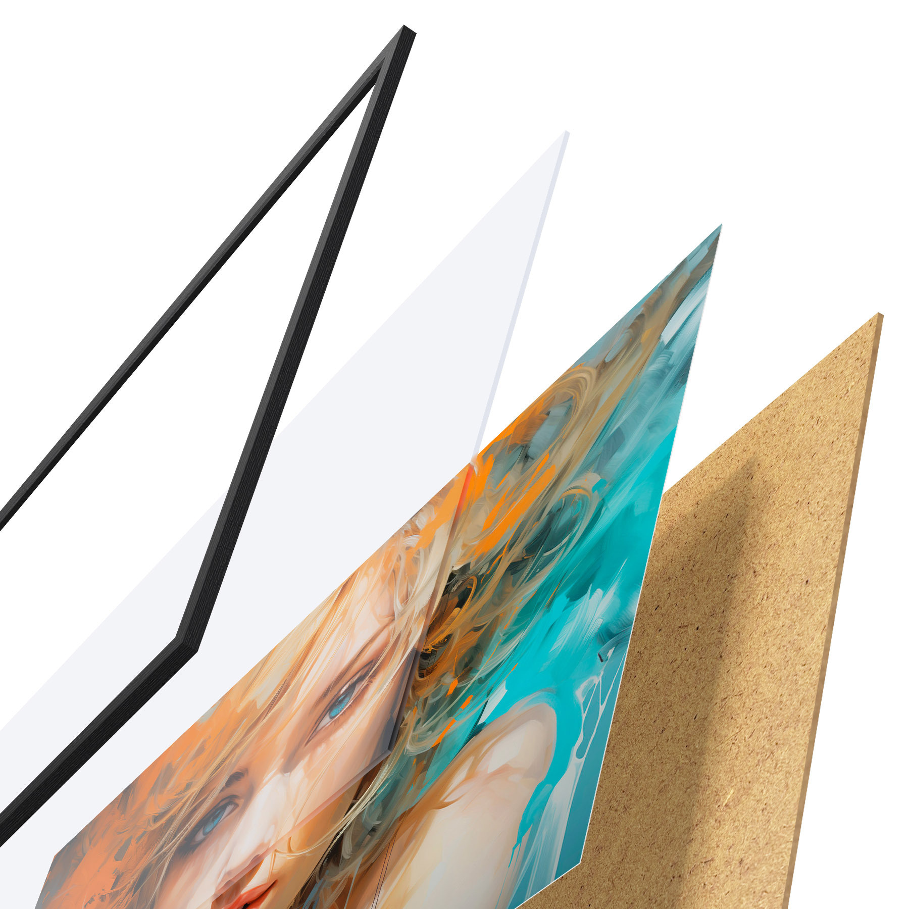 Das Poster besteht aus einem Rahmen, Plexiglas, einem gedruckten Bild und einer Rückwand aus Spanplatten. Dank der Halterungen auf der Rückseite kann das Poster sofort an die Wand gehängt werden.