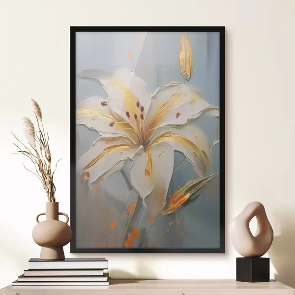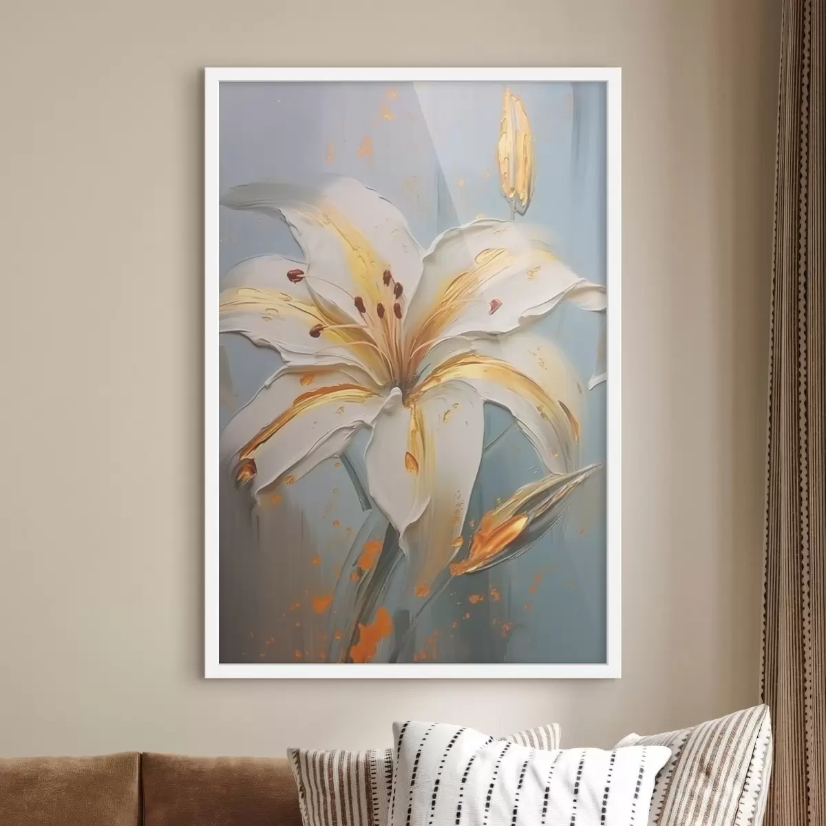 Poster Weiße Lilie mit gelben Strichen auf blauem Hintergrund Nr f45077