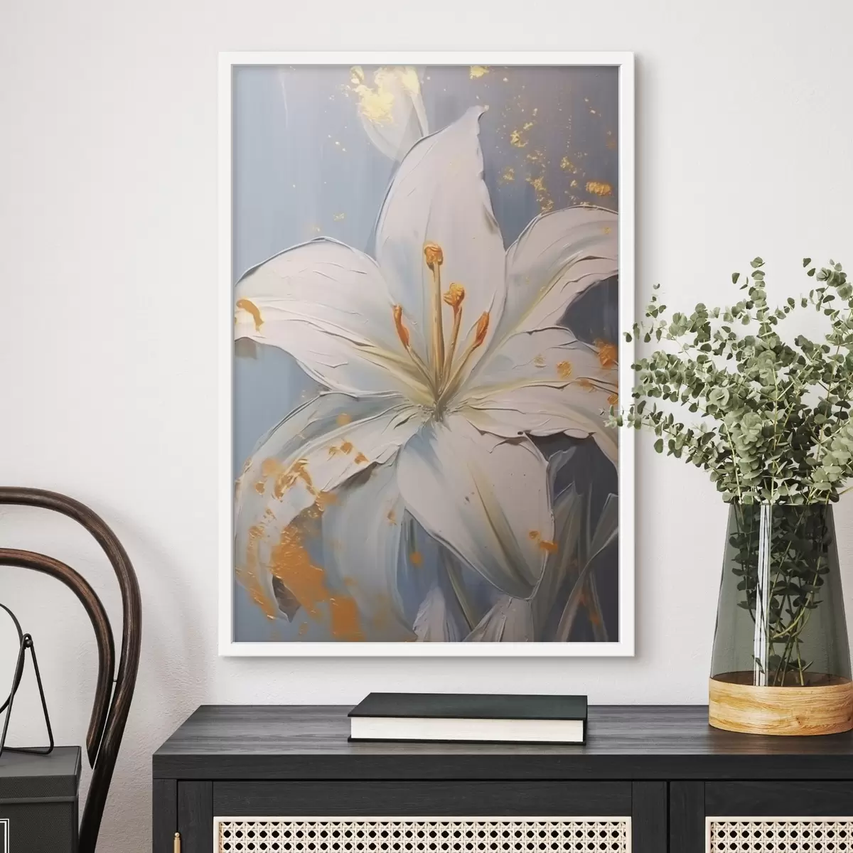 Poster Weiße Lilie mit gelben Akzenten auf blauem Hintergrund Nr f45078