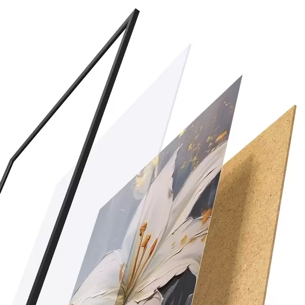 Das Poster besteht aus einem Rahmen, Plexiglas, einem gedruckten Bild und einer Rückwand aus Spanplatten. Dank der Halterungen auf der Rückseite kann das Poster sofort an die Wand gehängt werden.
