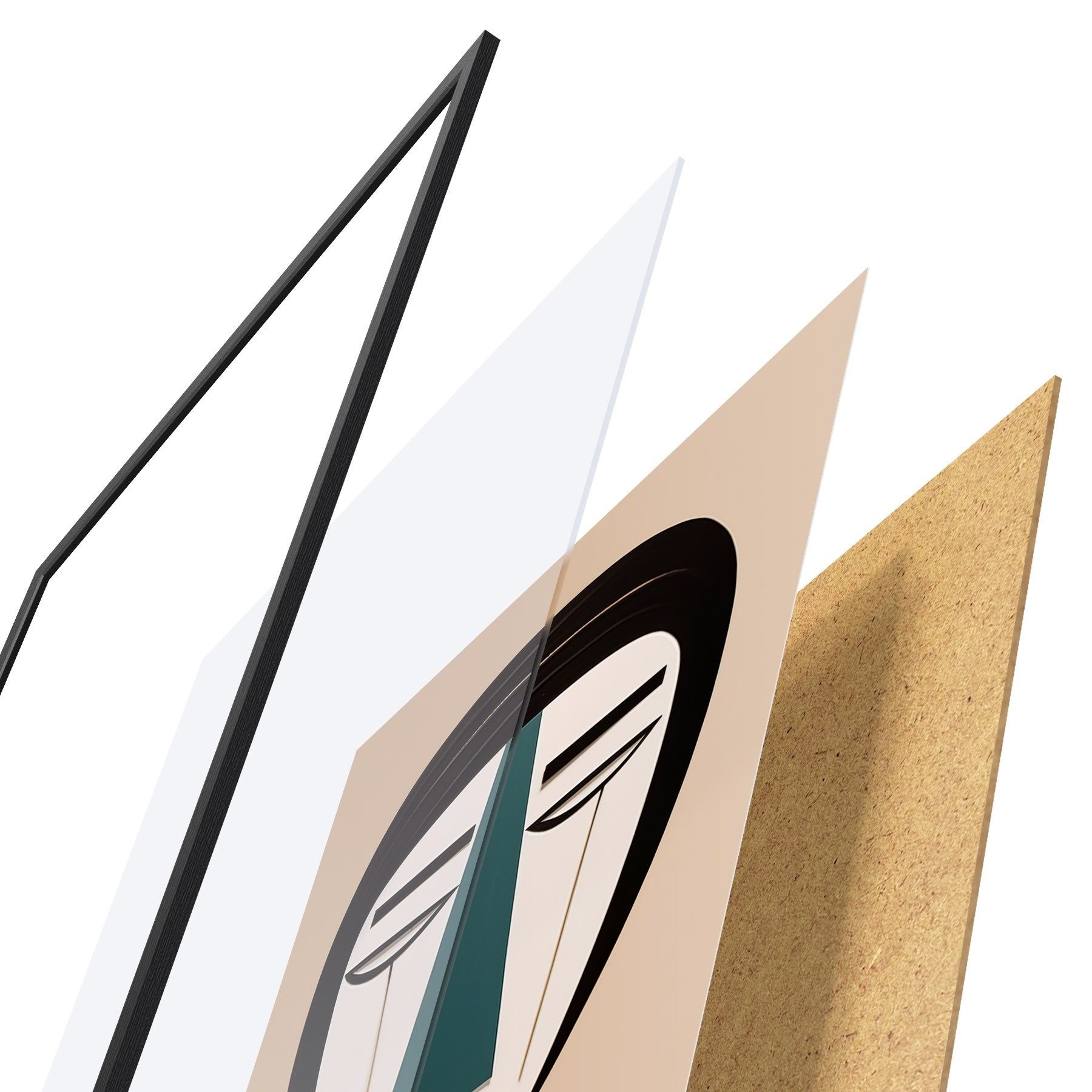 Das Poster besteht aus einem Rahmen, Plexiglas, einem gedruckten Bild und einer Rückwand aus Spanplatten. Dank der Halterungen auf der Rückseite kann das Poster sofort an die Wand gehängt werden.