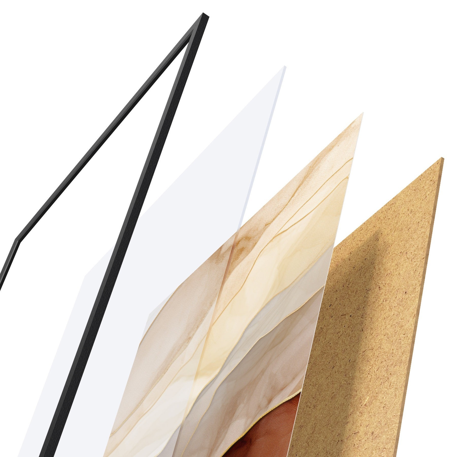 Das Poster besteht aus einem Rahmen, Plexiglas, einem gedruckten Bild und einer Rückwand aus Spanplatten. Dank der Halterungen auf der Rückseite kann das Poster sofort an die Wand gehängt werden.