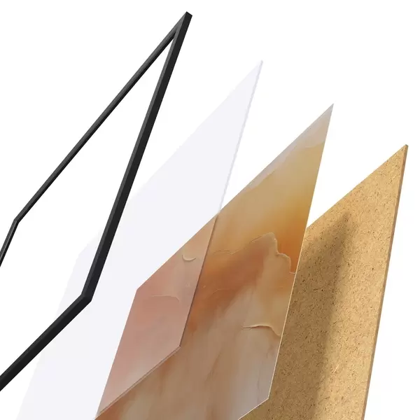 Das Poster besteht aus einem Rahmen, Plexiglas, einem gedruckten Bild und einer Rückwand aus Spanplatten. Dank der Halterungen auf der Rückseite kann das Poster sofort an die Wand gehängt werden.