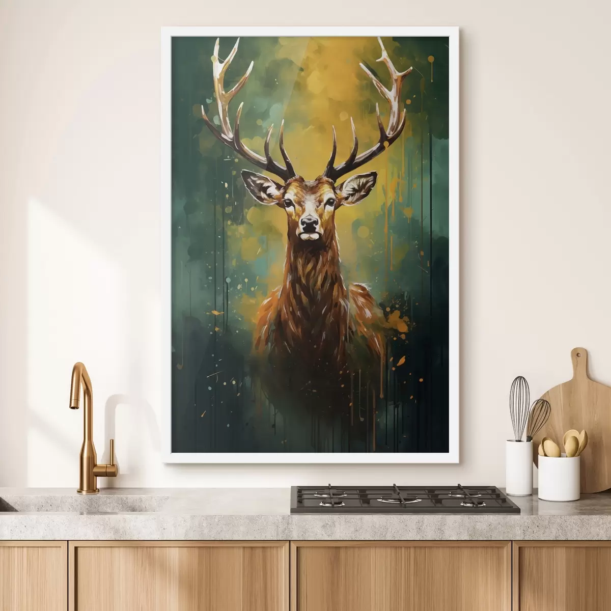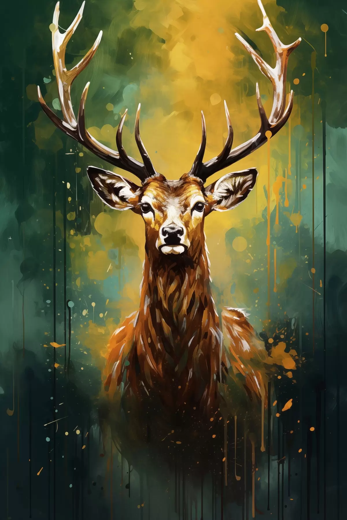 Poster hirsch, Geweih, waldgrün, orangefarbener Spritzer, Tierporträt, Farbtropfen, fett, Wildtiere f45111