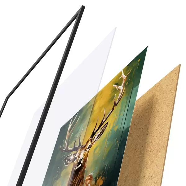 Das Poster besteht aus einem Rahmen, Plexiglas, einem gedruckten Bild und einer Rückwand aus Spanplatten. Dank der Halterungen auf der Rückseite kann das Poster sofort an die Wand gehängt werden.