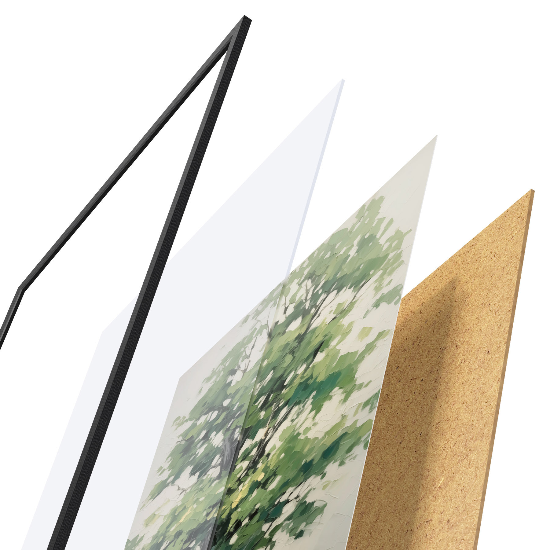 Das Poster besteht aus einem Rahmen, Plexiglas, einem gedruckten Bild und einer Rückwand aus Spanplatten. Dank der Halterungen auf der Rückseite kann das Poster sofort an die Wand gehängt werden.