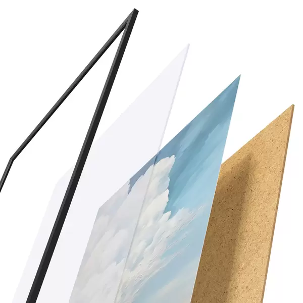 Das Poster besteht aus einem Rahmen, Plexiglas, einem gedruckten Bild und einer Rückwand aus Spanplatten. Dank der Halterungen auf der Rückseite kann das Poster sofort an die Wand gehängt werden.