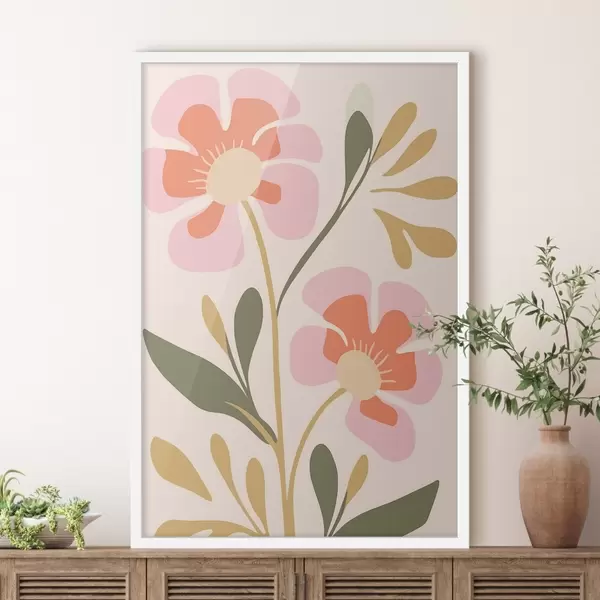 Poster Stilisierte rosa und orange Blumen mit grünen Blättern Nr f45140
