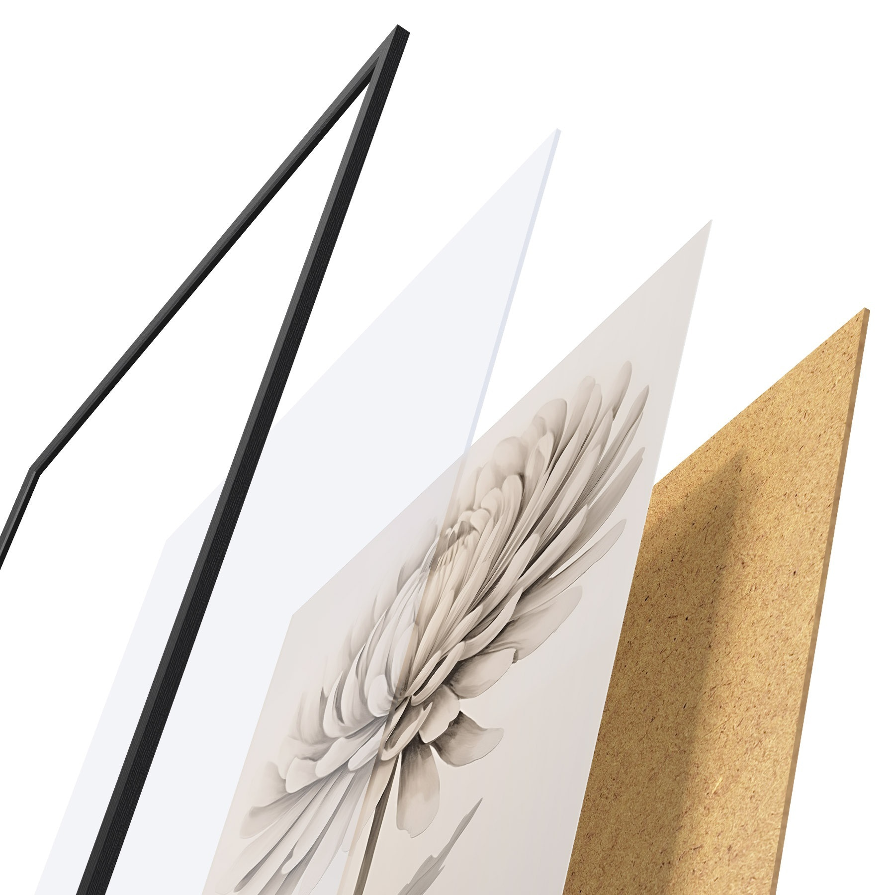 Das Poster besteht aus einem Rahmen, Plexiglas, einem gedruckten Bild und einer Rückwand aus Spanplatten. Dank der Halterungen auf der Rückseite kann das Poster sofort an die Wand gehängt werden.