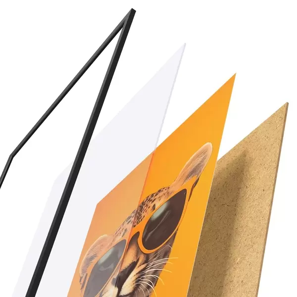 Das Poster besteht aus einem Rahmen, Plexiglas, einem gedruckten Bild und einer Rückwand aus Spanplatten. Dank der Halterungen auf der Rückseite kann das Poster sofort an die Wand gehängt werden.