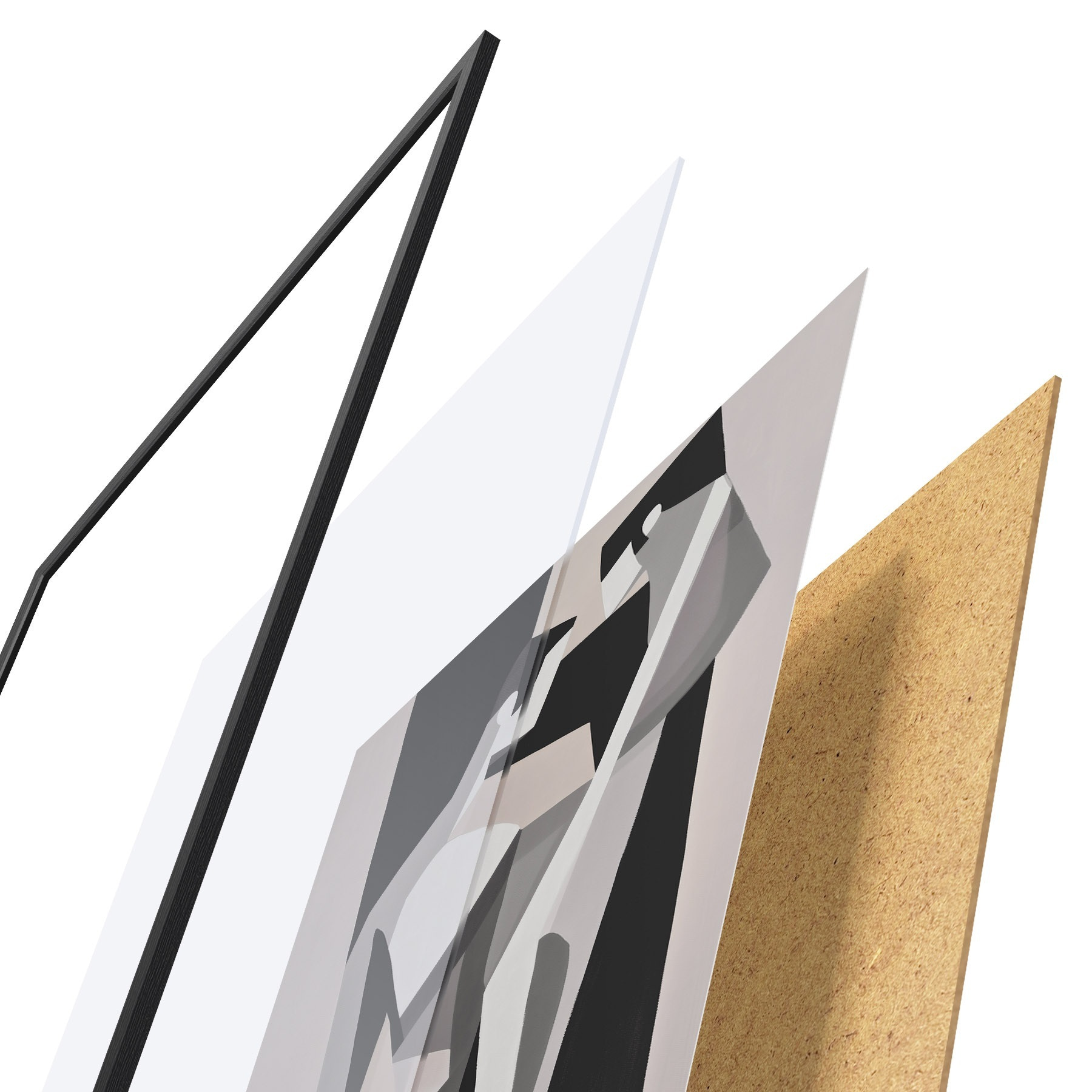 Das Poster besteht aus einem Rahmen, Plexiglas, einem gedruckten Bild und einer Rückwand aus Spanplatten. Dank der Halterungen auf der Rückseite kann das Poster sofort an die Wand gehängt werden.