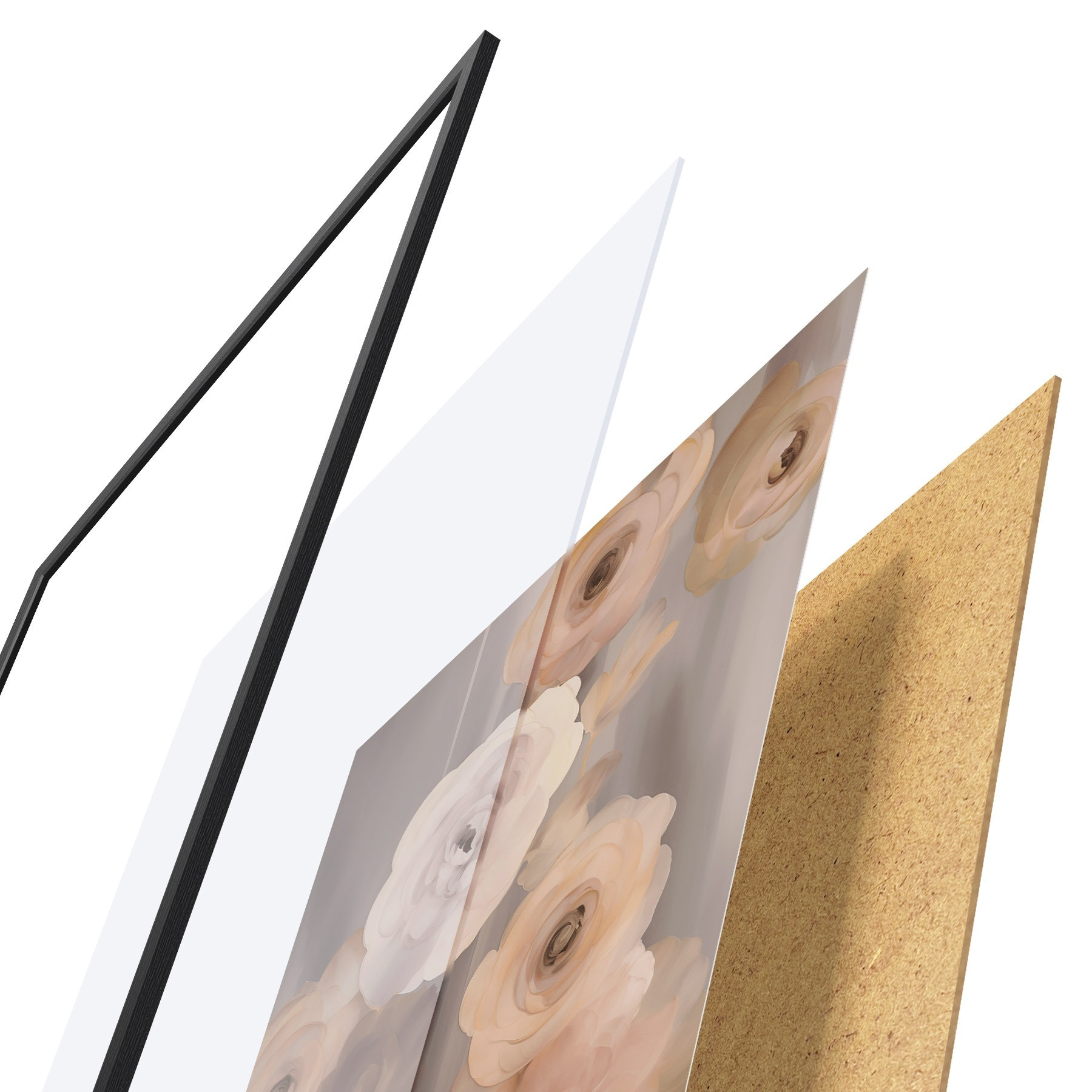 Das Poster besteht aus einem Rahmen, Plexiglas, einem gedruckten Bild und einer Rückwand aus Spanplatten. Dank der Halterungen auf der Rückseite kann das Poster sofort an die Wand gehängt werden.