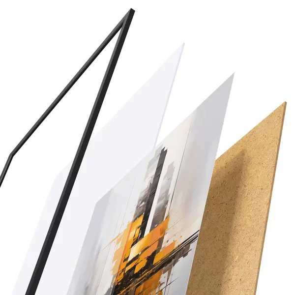 Das Poster besteht aus einem Rahmen, Plexiglas, einem gedruckten Bild und einer Rückwand aus Spanplatten. Dank der Halterungen auf der Rückseite kann das Poster sofort an die Wand gehängt werden.