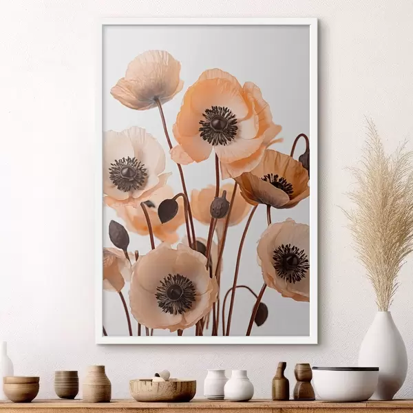 Poster Orangefarbene Mohnblumen, getrocknete Blumen vor einem hellen Hintergrund, weiche Beleuchtung, zarte Blütenblätter, Blumenarrangement f45168
