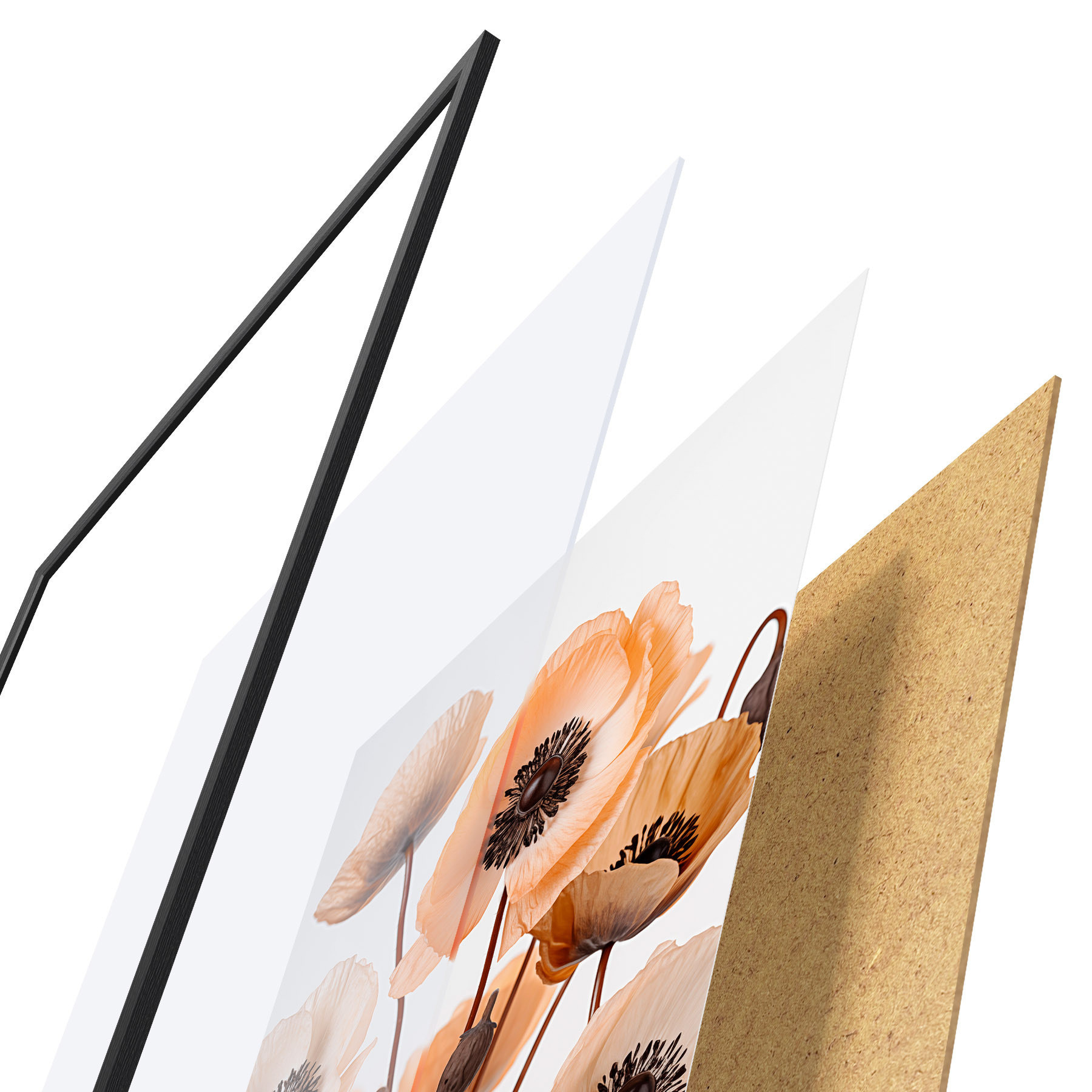 Das Poster besteht aus einem Rahmen, Plexiglas, einem gedruckten Bild und einer Rückwand aus Spanplatten. Dank der Halterungen auf der Rückseite kann das Poster sofort an die Wand gehängt werden.