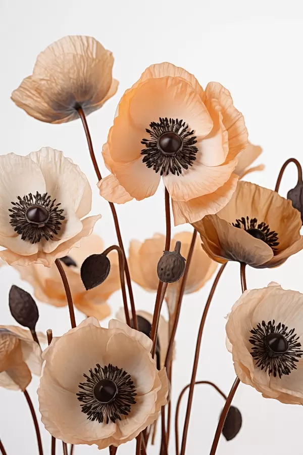 Poster Orangefarbene Mohnblumen, getrocknete Blumen vor einem hellen Hintergrund, weiche Beleuchtung, zarte Blütenblätter, Blumenarrangement f45168