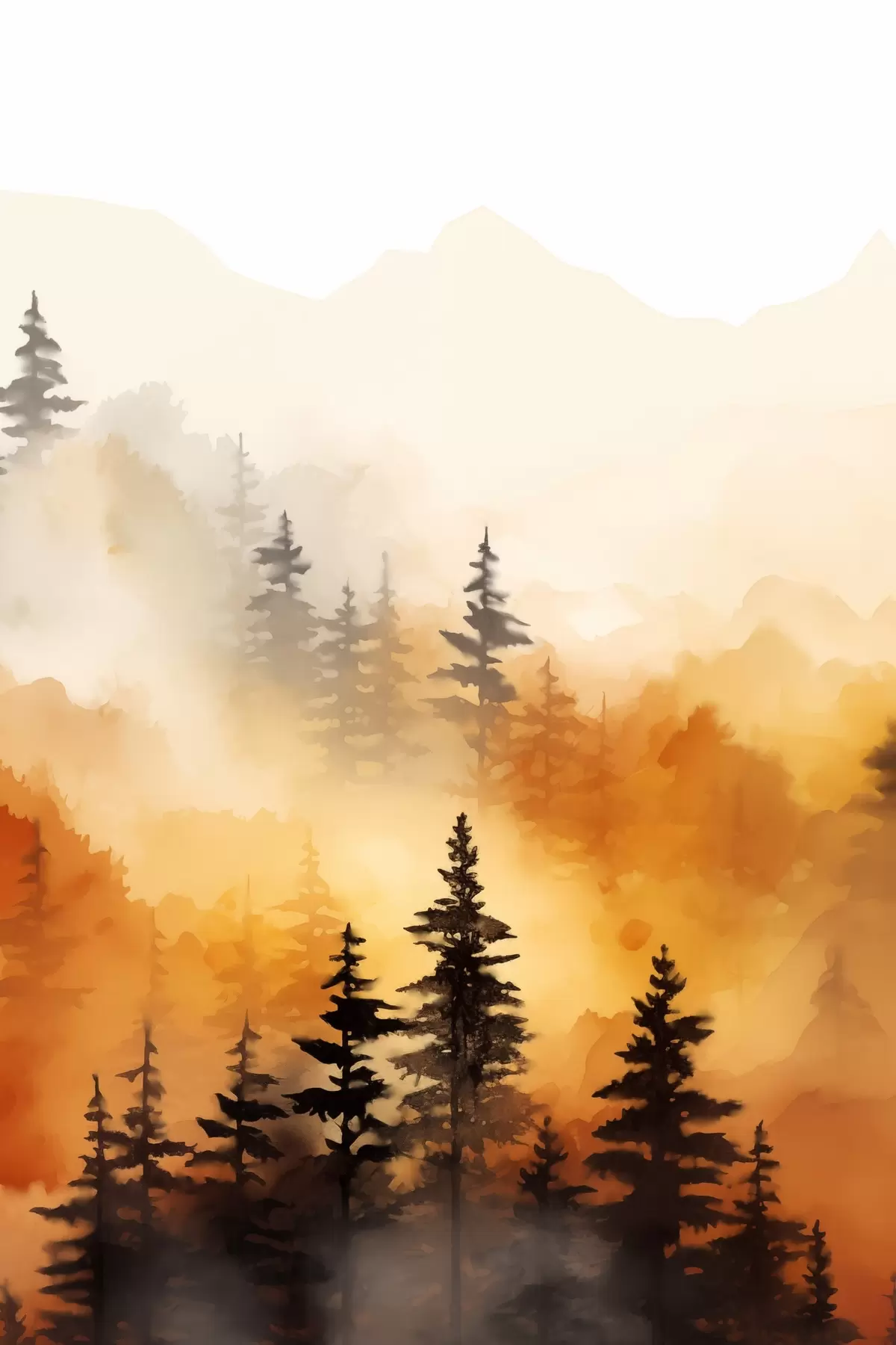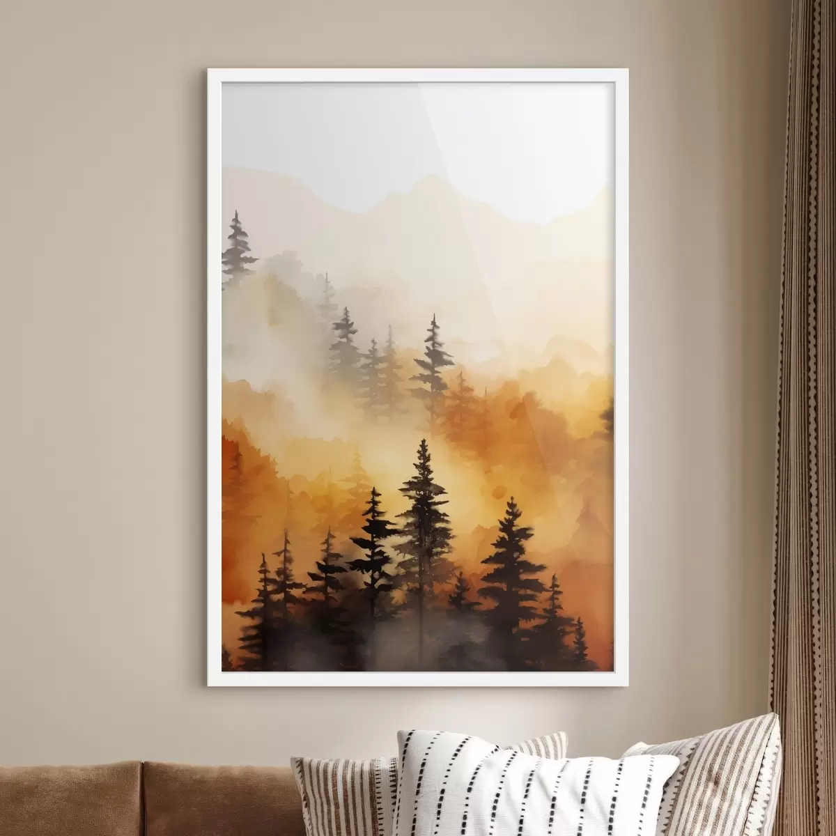 Poster Eine Landschaft Aquarell Malerei Nachahmung eines Waldes mit hohen Kiefern und Berge im Hintergrund Nr f45170