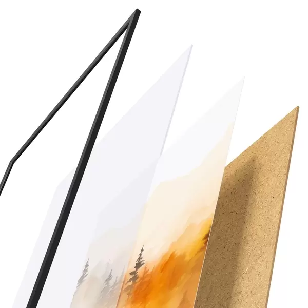 Das Poster besteht aus einem Rahmen, Plexiglas, einem gedruckten Bild und einer Rückwand aus Spanplatten. Dank der Halterungen auf der Rückseite kann das Poster sofort an die Wand gehängt werden.