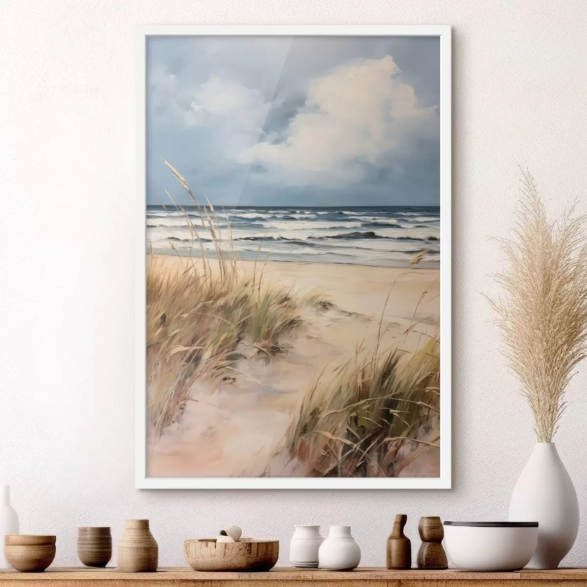 Poster Ein Sandstrand mit hohem Gras im Vordergrund, das Meer mit Wellen und ein bewölkter Himmel im Hintergrund Nr f45173
