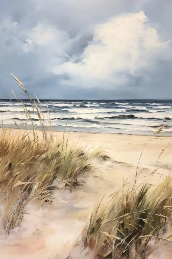 Poster Ein Sandstrand mit hohem Gras im Vordergrund, das Meer mit Wellen und ein bewölkter Himmel im Hintergrund Nr f45173