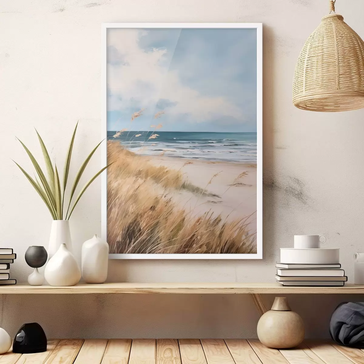 Poster Ein Sandstrand mit hohem Gras im Vordergrund, das Meer mit Wellen und ein bewölkter Himmel im Hintergrund Nr f45174