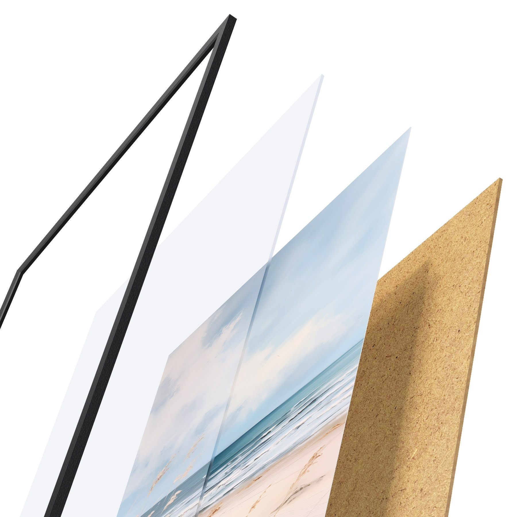 Das Poster besteht aus einem Rahmen, Plexiglas, einem gedruckten Bild und einer Rückwand aus Spanplatten. Dank der Halterungen auf der Rückseite kann das Poster sofort an die Wand gehängt werden.