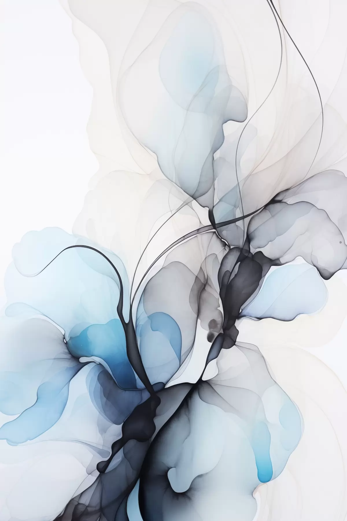 Poster Abstrakte Komposition mit fließenden Linien und durchscheinenden Blütenblättern in blauen, weißen und beigen Farbtönen, Alkoholtintenimitation Nr f45177