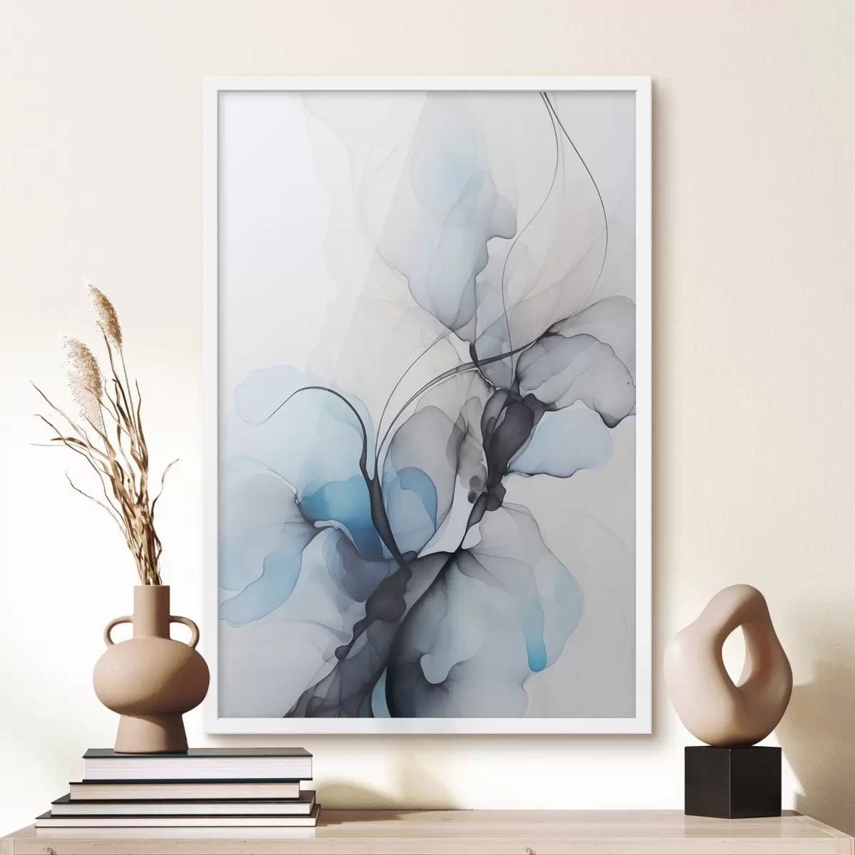 Poster Abstrakte Komposition mit fließenden Linien und durchscheinenden Blütenblättern in blauen, weißen und beigen Farbtönen, Alkoholtintenimitation f45177