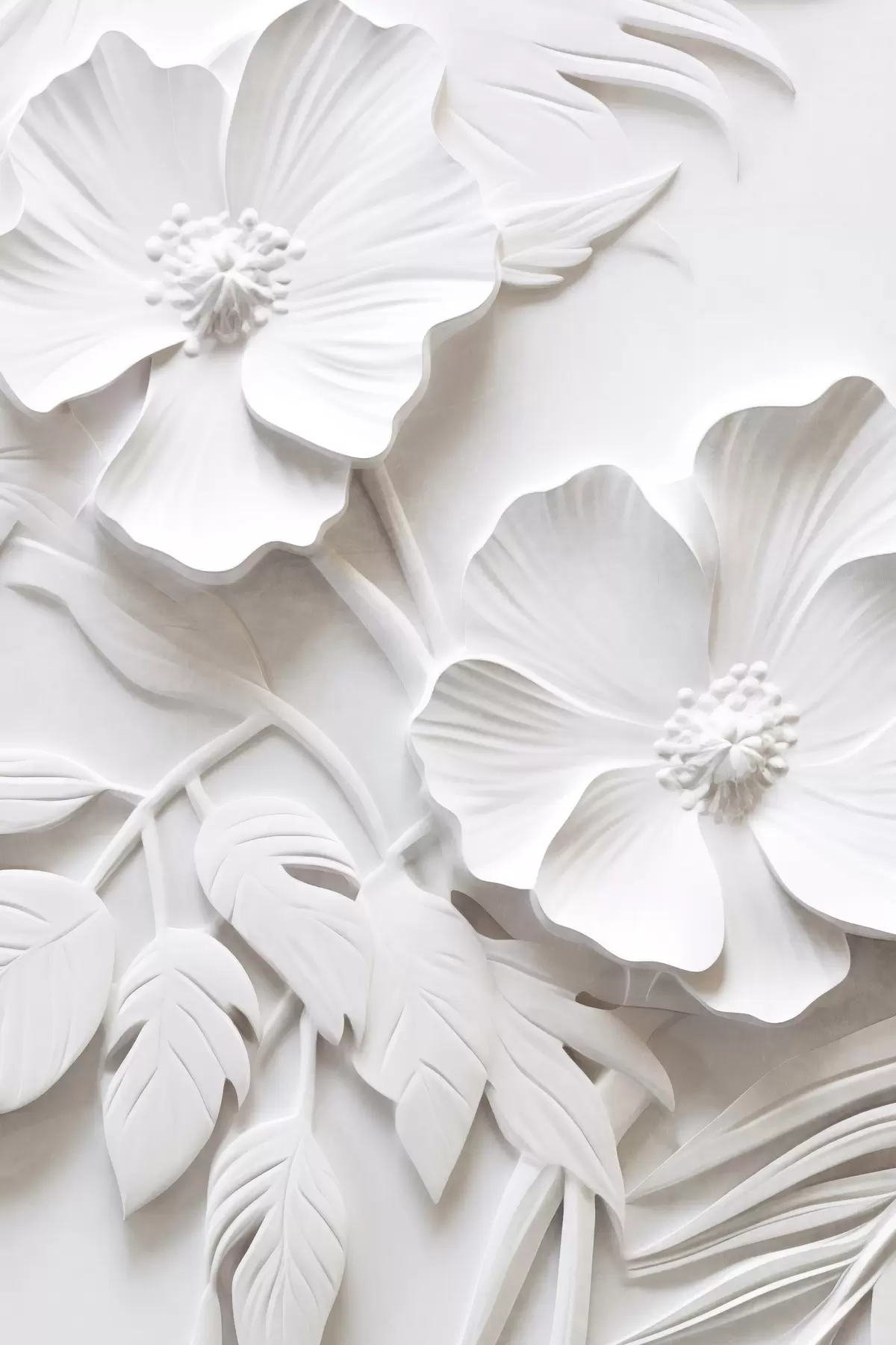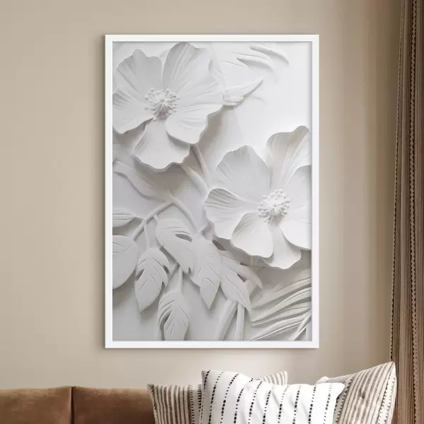 Poster Dekorative minimalistische weiße Blumen mit Blättern, Relief-Imitation, weißer Hintergrund f45179