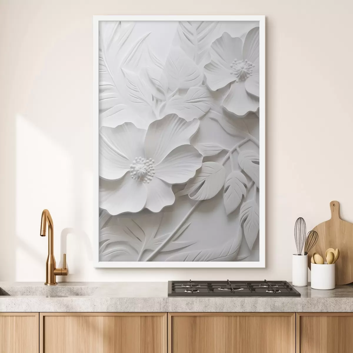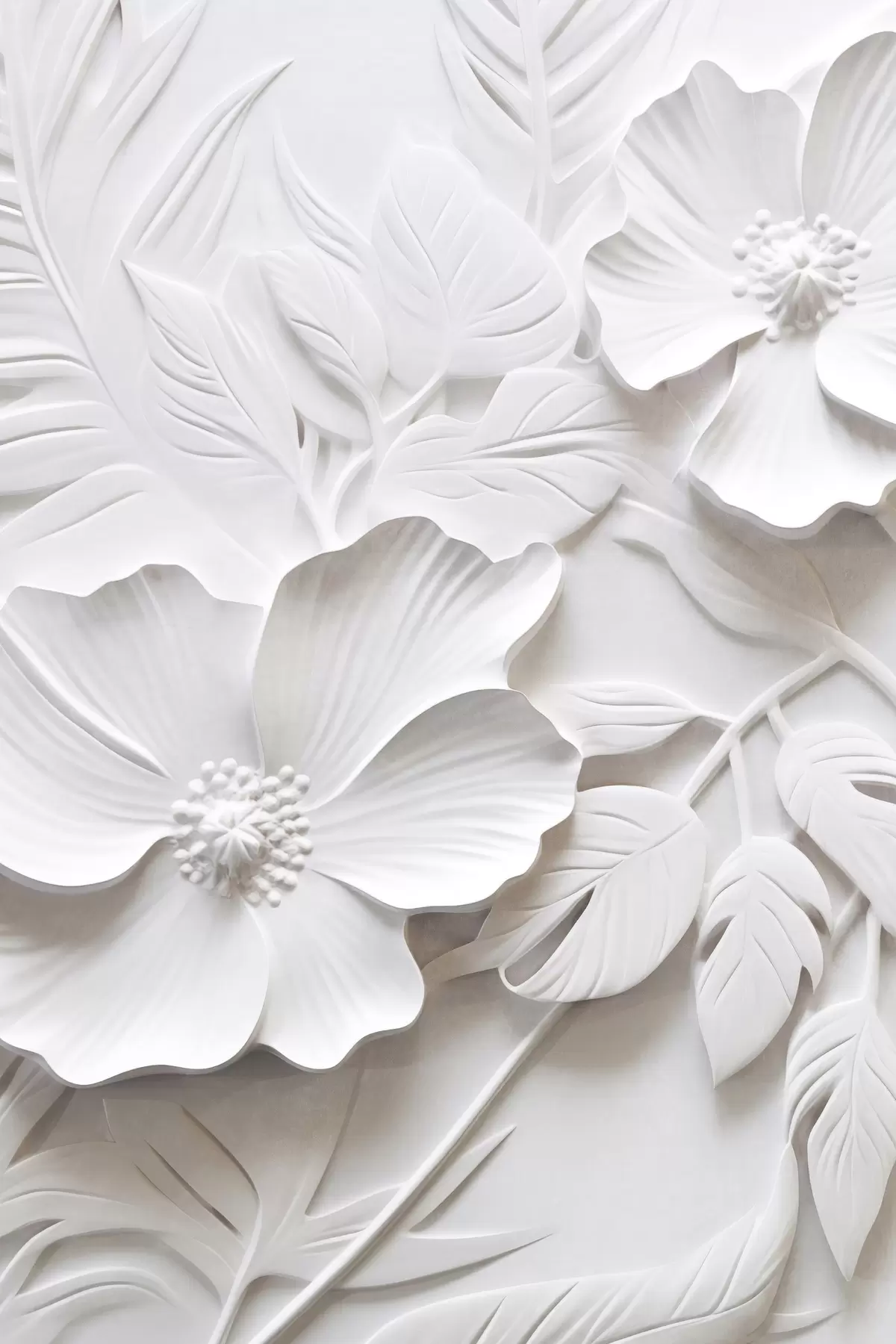 Poster Dekorative minimalistische weiße Blumen mit Blättern, Relief-Imitation, weißer Hintergrund Nr f45180