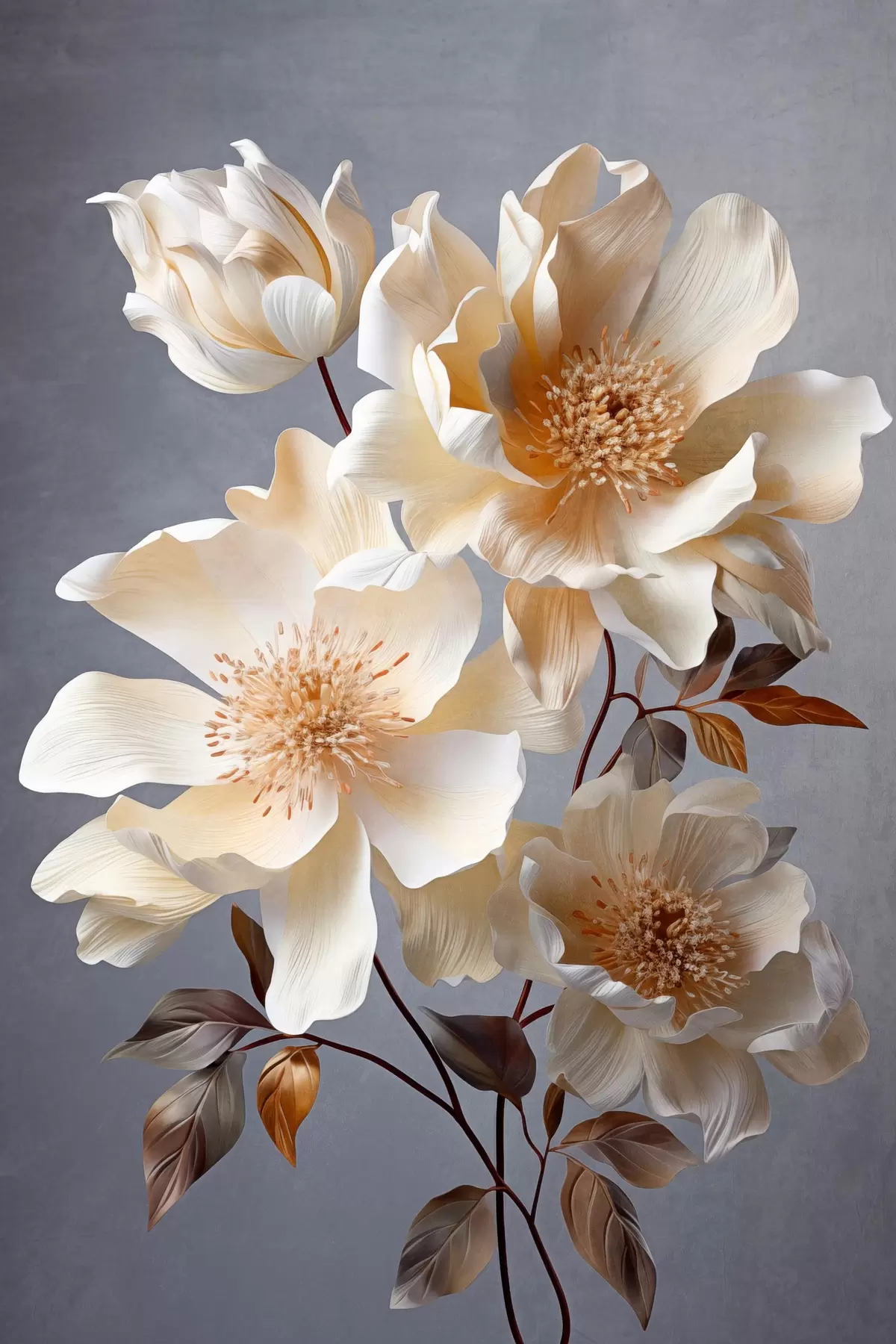 Poster Texturierte Blumen mit orangefarbenen Blütenstempeln und orangefarbenen Blättern auf grauem Hintergrund, weiches Licht, elegant, detailliert, realistisch f45181