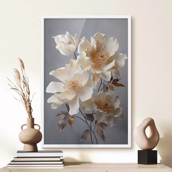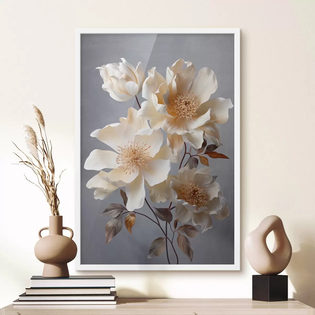 Poster Texturierte Blumen mit orangefarbenen Blütenstempeln und orangefarbenen Blättern auf grauem Hintergrund, weiches Licht, elegant, detailliert, realistisch Nr f45181