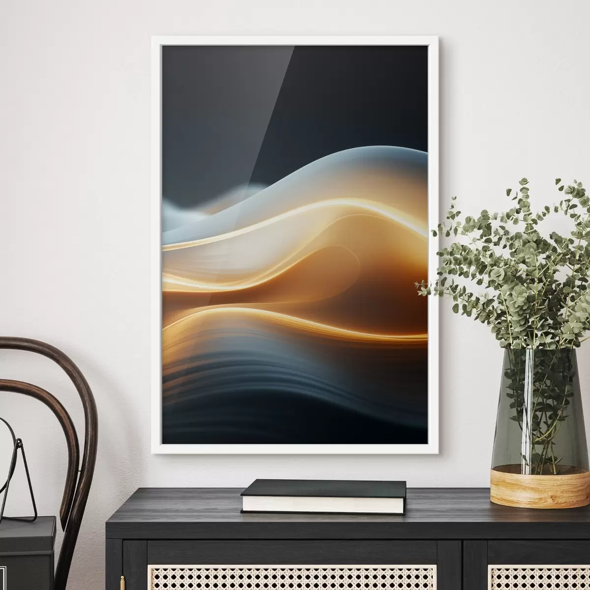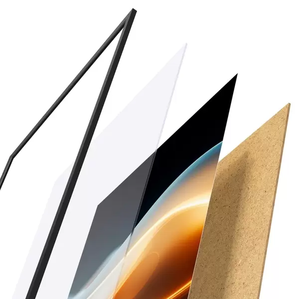 Das Poster besteht aus einem Rahmen, Plexiglas, einem gedruckten Bild und einer Rückwand aus Spanplatten. Dank der Halterungen auf der Rückseite kann das Poster sofort an die Wand gehängt werden.