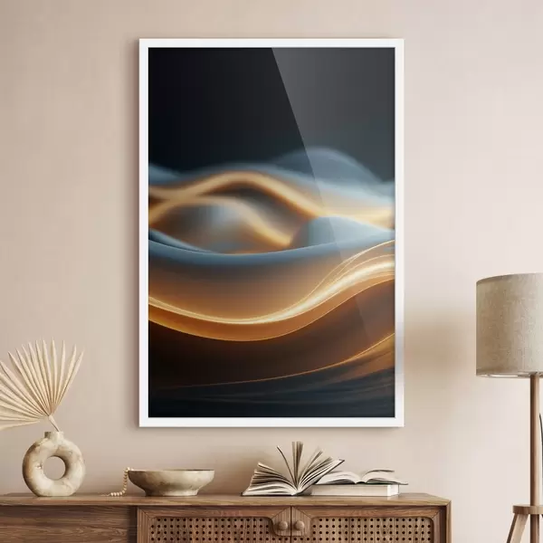 Poster Abstrakte fließende Formen mit orangefarbenen Linien, glatte Kurven und Linien, dynamische Komposition, dunkler Hintergrund Nr f45184