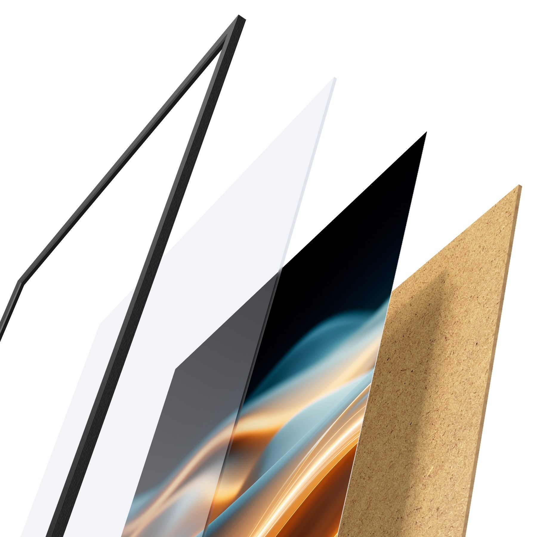 Das Poster besteht aus einem Rahmen, Plexiglas, einem gedruckten Bild und einer Rückwand aus Spanplatten. Dank der Halterungen auf der Rückseite kann das Poster sofort an die Wand gehängt werden.
