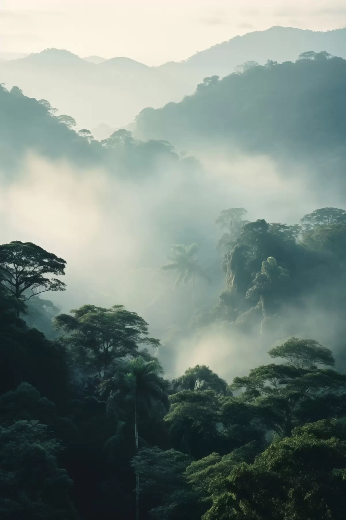 Poster Tropischer Regenwald mit üppig grünen Bäumen und einer dicken Nebelschicht, die eine stimmungsvolle Umgebung schafft f45189