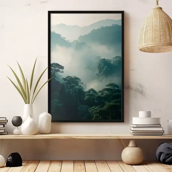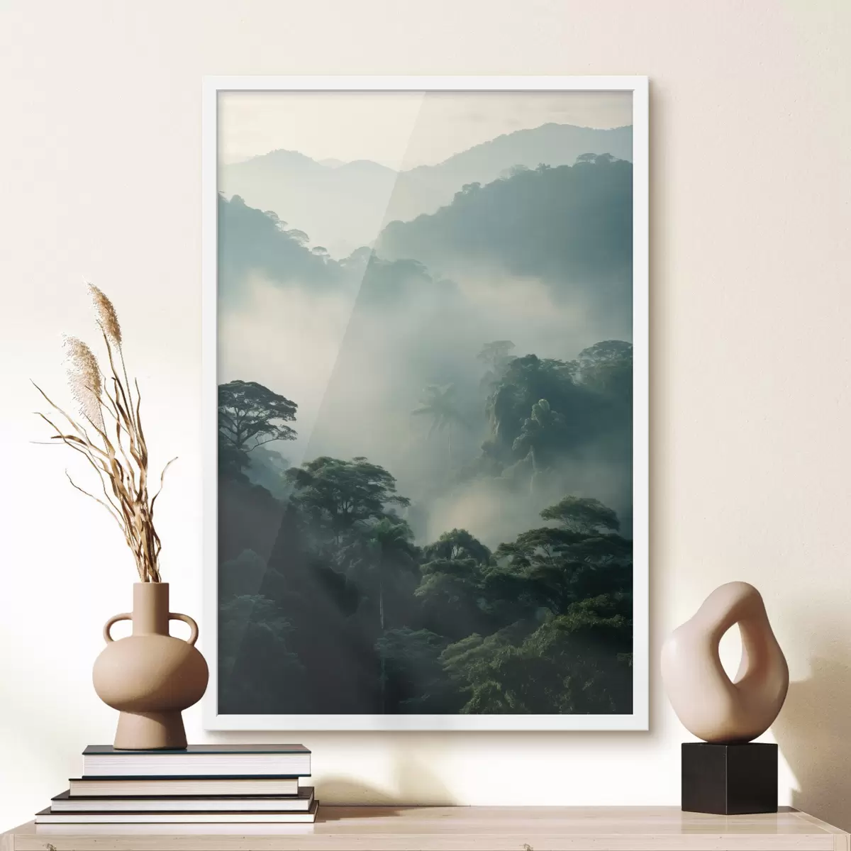 Poster Tropischer Regenwald mit üppig grünen Bäumen und einer dicken Nebelschicht, die eine stimmungsvolle Umgebung schafft Nr f45189