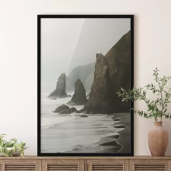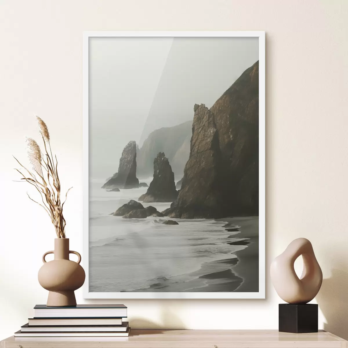 Poster Felsige Klippen und Meeresküste, Wellen, die an das Ufer schlagen, Landschaft mit stimmungsvoller Atmosphäre, erdige Töne f45193