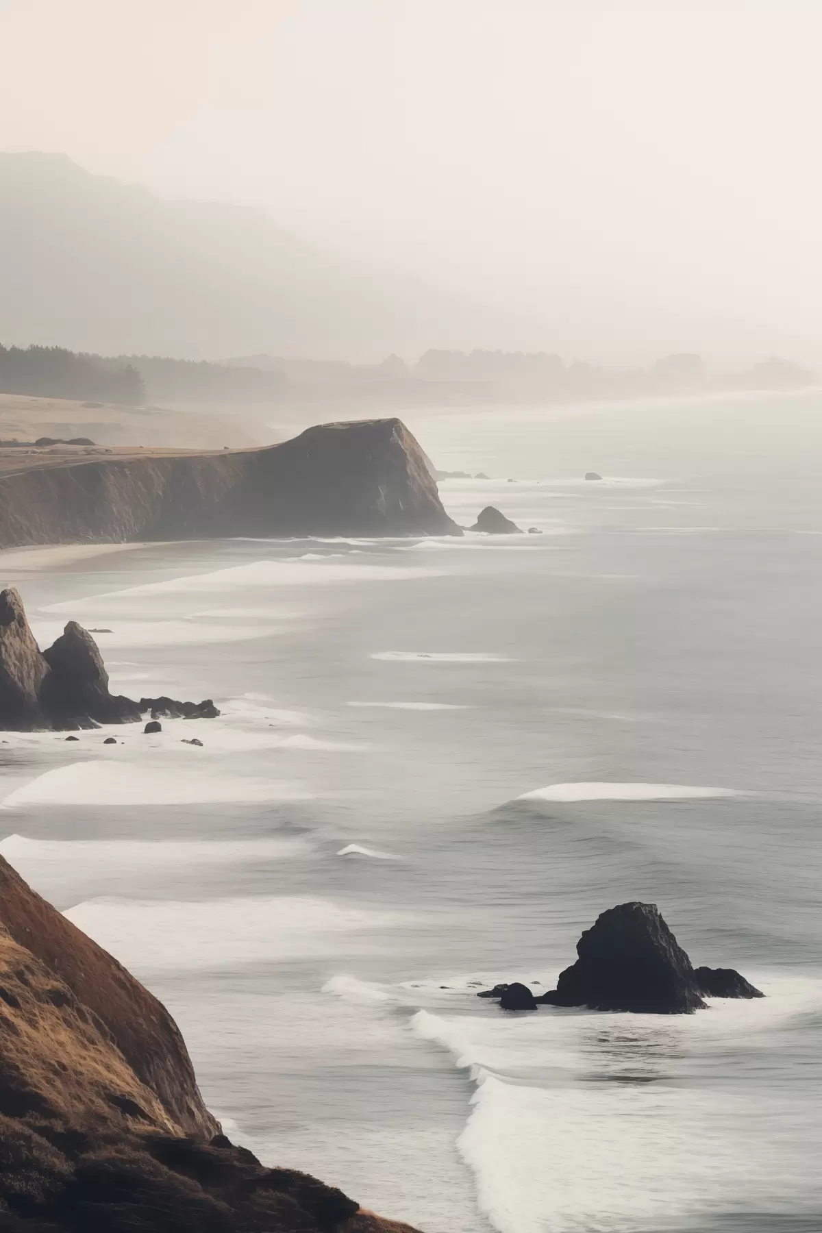 Poster Felsige Klippen und Meeresküste, Wellen, die an das Ufer schlagen, Landschaft mit stimmungsvoller Atmosphäre, erdige Töne Nr f45194