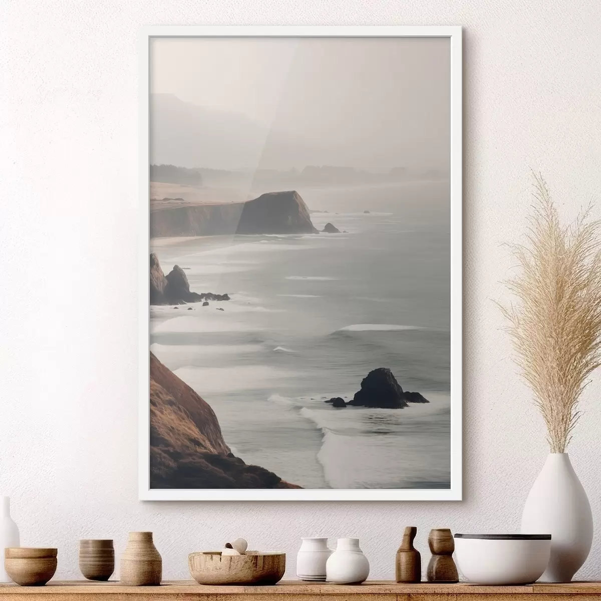 Poster Felsige Klippen und Meeresküste, Wellen, die an das Ufer schlagen, Landschaft mit stimmungsvoller Atmosphäre, erdige Töne f45194