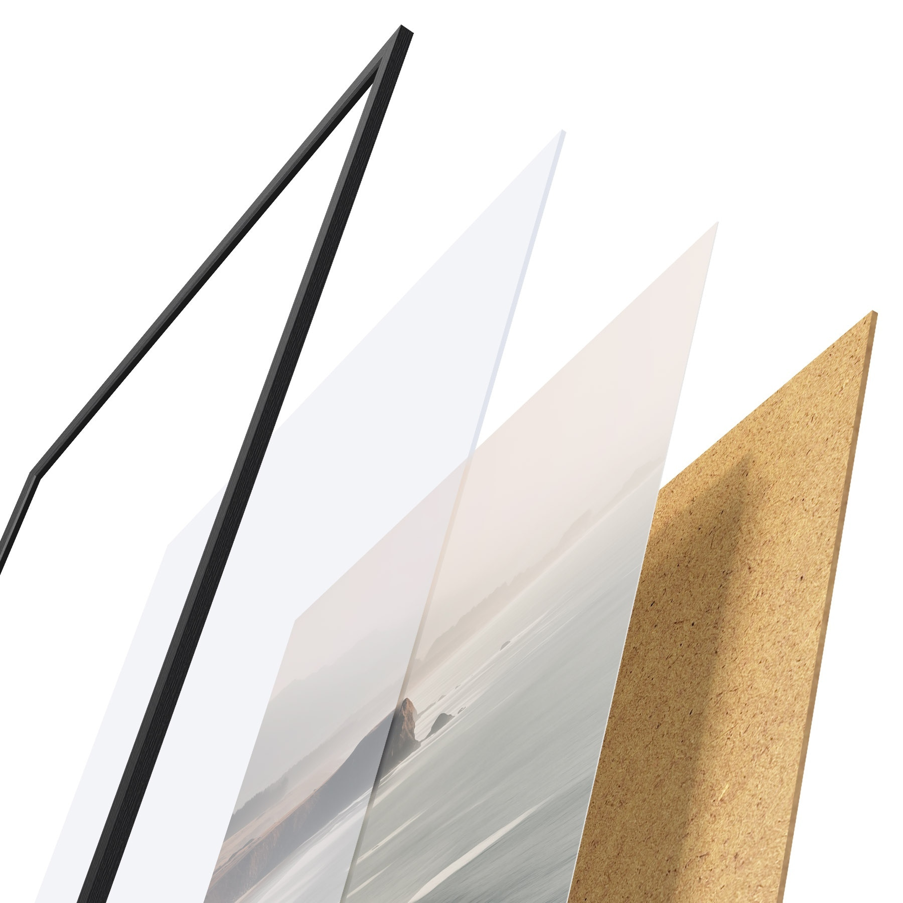 Das Poster besteht aus einem Rahmen, Plexiglas, einem gedruckten Bild und einer Rückwand aus Spanplatten. Dank der Halterungen auf der Rückseite kann das Poster sofort an die Wand gehängt werden.