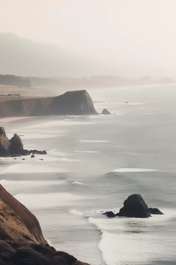 Poster Felsige Klippen und Meeresküste, Wellen, die an das Ufer schlagen, Landschaft mit stimmungsvoller Atmosphäre, erdige Töne f45194